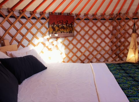 We houden van onze yurt! We laten ons meeslepen, welke veiligheid het uitstraalt en welke vrede zich verspreidt. En zelfs in een Andalusische midzomer is het aangenaam - natuurlijk ook vanwege de ligging aan de rivier. Maar ook de constructie met vier lagen stof en een dikke laag schapenwol zorgt voor een optimale isolatie. De koepel, met kleine afneembare ramen, zorgt voor ventilatie. De yurt is uitgerust met een houten bed (1,80 x 2,00 meter + kleinere bedden voor kinderen indien nodig) en biedt plaats aan één tot vier personen. De gezellige yurt is voorzien van een kleine kast, tafel en stoel. Buiten is er een eigen terras met uitzicht op de vallei en rotsen, tuinmeubilair en een kleine tuin met gootsteen. Het natuurlijke huis heeft een eigen droog toilet en een douche op zonne-energie. De yurt heeft ook kleine zonnepanelen voor elektriciteit. U ook genieten van het uitzicht op een douche onder een oude vijgenboom met altijd warm water.