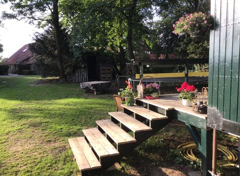 De salonwagen staat op een idyllische locatie, aan de rand van een privé-eikenbos met uitzicht over de velden en paardenweien aan de ene kant en een open plek in het bos aan de andere. Hier word je wakker van het vogelconcert, zie je konijnen in het bos, hazen in het veld en als je geluk hebt een das, ree of vos. Het is heerlijk zitten op de schaduwrijke veranda voor en er is rondom ruimte voor zitjes. Er is een trampoline en een skelter. Voor de auto is voldoende plek. Het is gelegen aan mooie struinpaden en de fietsknooppuntenroute. De Maas is 500 meter verderop. Het dorp is op 1,5 km afstand. Het natuurgebied de Overasseltse- en Hatertse Vennen is om de hoek. Ook dichtbij is sauna De Berendonck. Kom je met de trein dan kun je in Wijchen een fiets huren; binnen een half uur ben je hier. Op 12 km ligt Nijmegen, een gezellige studentenstad waar altijd wat te doen is.