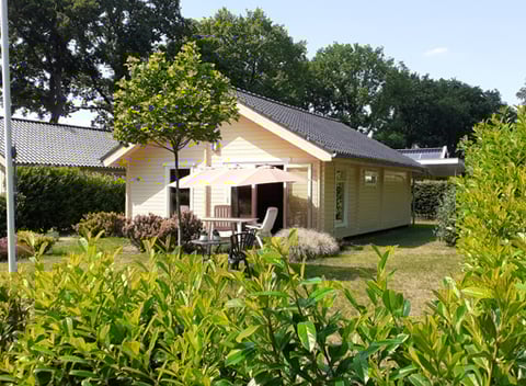 Wij hebben deze gezellige houten bungalow geerfd van onze vader. Het natuurhuisje heeft een gezellige kamer met grote openslaande deuren naar het terras, twee slaapkamers (4 personen), douche en apart toilet, volledig ingerichte keuken, beschikking over wasmachine en droger. Wifi aanwezig. Buiten rondom een groot gazon, een schuur waar u eventuele fietsen kunt stallen met daarin ook de mogelijkheid voor laden. Het vakantiehuisje ligt op een klein park en heeft een eigen parkeerplaats.