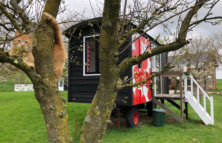 Hoe romantisch, deze tiny pipowagen. Vanuit je elektrisch verstelbare bed kijk je de boomgaard in en heb je vrij uitzicht over het weiland. Daar zie je 's morgens de zon opkomen. Je verblijft in een hoogstamboomgaard met twintig fruitbomen. Af en toe komen onze katten Kas en Moederpoes een kijkje nemen. (Ze mogen alleen niet naar binnen...) In dit knusse gastenverblijf naast de moestuin vind je alles wat je nodig hebt: egein douche, wc, keukenblokje met koelkastje en keukengerei, en een ventilator boven het bed. Zoek je een origineel, romantisch stulpje op een landelijke plek met eigen voorzieningen? Dan is dit echt iets voor jou. NB: Linnenpakket apart bijboeken! Tip: lees het feel good boek 'Ik vertrek naar het platteland' dat zich helemaal afspeelt op deze plek. Zie je je hier al zitten genieten? Boek je een linnenpakket, dan zitten daar uiteraard ook keukendoeken bij. Koffie zet je met een Italiaanse perculator.