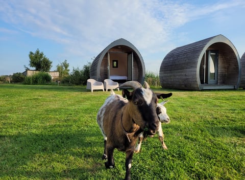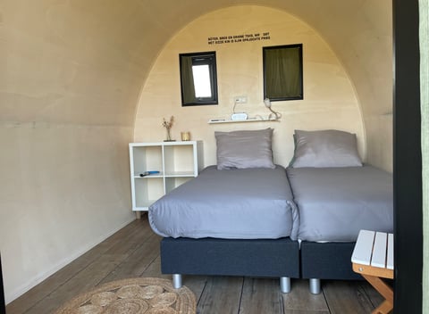 Overnachten in een pod op het groene gras in de luwte van monumentale boerderij op nog geen 10 minuten fietsen van het stadscentrum van Leeuwarden. Het monumentale hoofdgebouw, een oude stelpboerderij is in 2018 volledig gerestaureerd door 2 gezinnen. Bij het overnachten in een Pod kan er gebruik gemaakt worden van diverse faciliteiten in het nog te restaureren voorhuis. Rust en ruimte gegarandeerd ! Slapen doe je op een comfortabele boxspring, wakker worden en kijken over Friese landerijen.